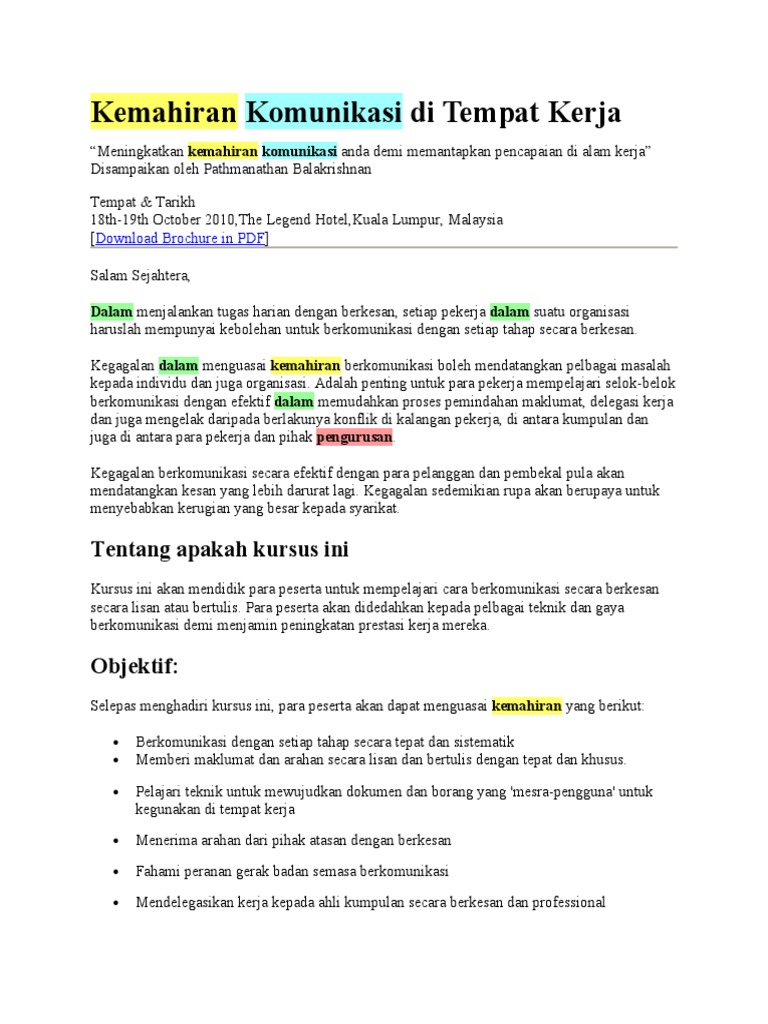 Pemakluman berkaitan aktiviti latihan kemahiran dan pentauliahan program bertauliah selaras pengumuman arahan perintah kawalan pergerakan (pkp) oleh yab. Kemahiran kerja berpasukan digalakkan supaya sesuatu kerja yang berat akan menjadi ringan. Salah satu pertanyaan yang paling umum dilontarkan oleh pewawancara. Kepentingan penguasaan kemahiran komunikasi dalam kalangan pensyarah intitusi pengajian tinggi zunaedah binti sahrul pengajaran dan pembelajaran melibatkan interaksi di antara pensyarah dengan pelajar. Kepentingan pendidikan tinggi dalam menghasilkan graduan yang berpengetahuan dan kompeten pada abad sebelum melangkah ke alam pekerjaan graduan perlu membuat persiapan dari pelbagai aspek antaranya kemahiran komunikasi secara berkesan dan beberapa kemahiran lain seperti.