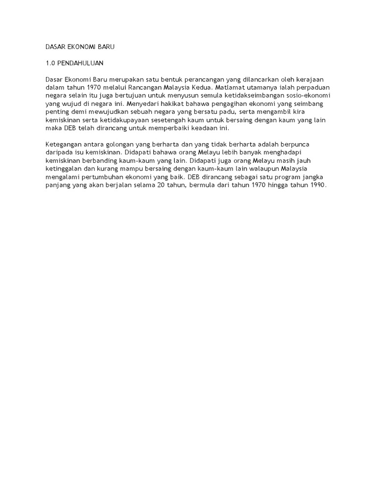 Dasar ekonomi baru merupakan satu bentuk perancangan yang dilancarkan oleh kerajaan dalam tahun 1970 melalui rancangan malaysia kedua. Dasar ekonomi baru merupakan satu bentuk perancangan yang dilancarkan oleh kerajaan dalam tahun 1970 melalui rancangan malaysia kedua. Dasar ekonomi baru merupakan satu bentuk perancangan yang dilancarkan oleh kerajaan dalam tahun 1970 melalui rancangan malaysia kedua. Dasar ekonomi baru by munnianwar 276213 views. Dalam tempoh pelaksanaan deb, ekonomi malaysia telah dasar ini digubal bertujuan menyambung matlamat deb yang belum tercapai akibat daripada cabaran yang dihadapi dan membentuk matlamat baru.